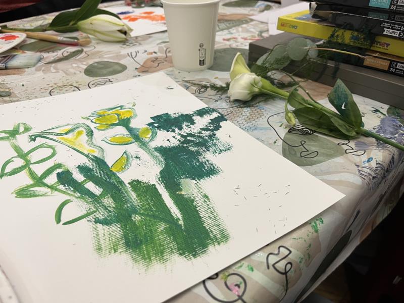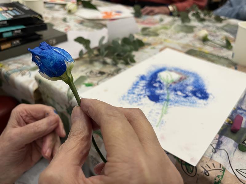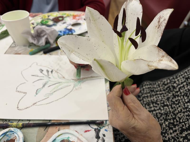 Lors de l’atelier peinture animé avec notre art-thérapeute, les résidents ont exploré la beauté des fleurs (roses, lys...) en les peignant à leur manière. Certains ont même utilisé les fleurs elles-mêmes comme pinceaux, donnant naissance à des œuvres originales !
